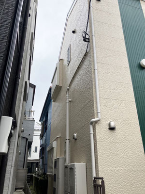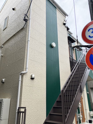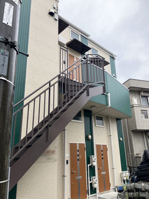 屋根や外壁、廊下、鼻かくし、軒天、外廊下手すり、雨水管の塗装の他、階段の隙間、ドア下の破損などの補修工事も行いました。