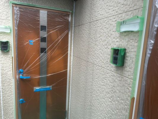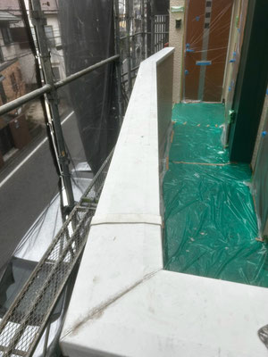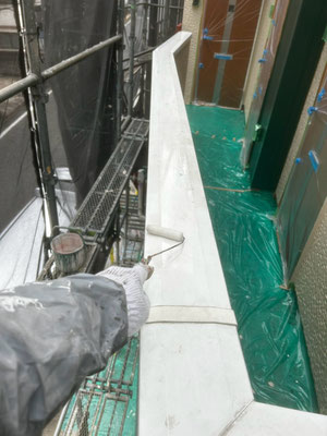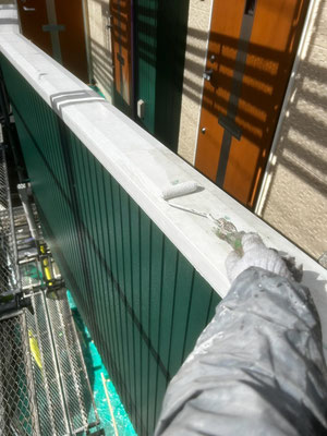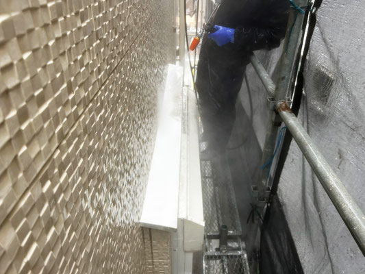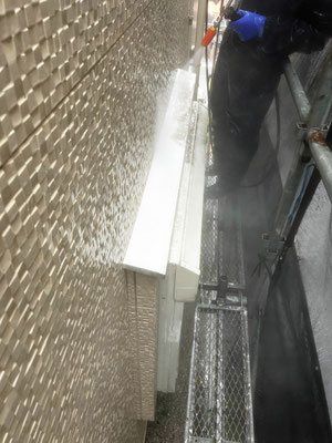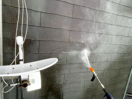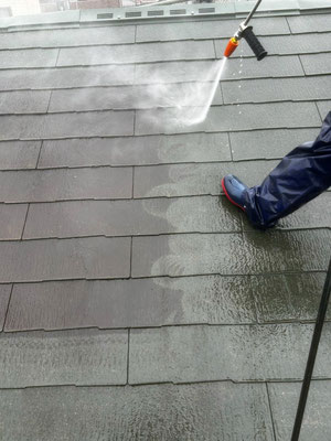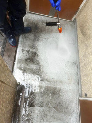 ・高圧洗浄で隅から隅まで汚れを落とします。写真は屋根、共有廊下、外壁です。